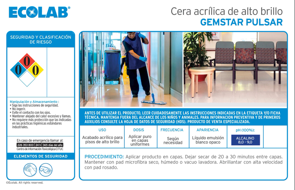 El Ecolab Gemstar Pulsar es un acabado acrílico de alto rendimiento y brillo superior, diseñado para proteger y embellecer pisos resistentes al agua en entornos de alto tráfico. Este producto de 5 litros proporciona un sello duradero que resiste las marcas de rozaduras y facilita el mantenimiento diario, asegurando que sus pisos luzcan profesionales y pulidos.